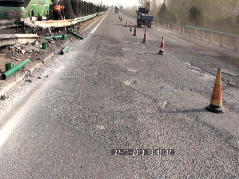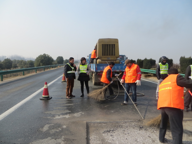 為確保春運暢通,應(yīng)安徽省交通投資集團道路養(yǎng)護管理有限公司、高速公路六安管理公司的要求,在合六葉高速公路七大隊和路政大隊的協(xié)助下,我單位于2014年1月15日對合六葉高速公路下行線11月22日交通事故損毀路段(K668+000m-K667+930m)進行搶修養(yǎng)護,于16日下午15:00圓滿竣工。